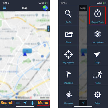 MotionX GPSを起動すると、地図画面が現れます。右上の地球儀アイコンが青色になっていれば、GPSログを取得できる状態です。起動した直後や、GPSの信号が弱い場合は、地球儀アイコンが赤色になりますが、この状態だとGPSログは取得できません。時間をおいて青色になるのを待ちましょう。地球儀アイコンが青色になっていることを確認できたら、右下の「Menu」をタップします(画像左)。メニューが現れたら、右上の「Record Track」をタップします(画像右)。