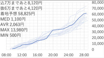 通常は、朝8時半過ぎに出庫して、翌朝4時半過ぎに帰庫します。その約20時間の乗務で、多いときは40組以上、平均してもだいたい30組前後のお客さんをお乗せします。それぞれのお客さんに対して料金が発生しますから、降車時の時刻と料金を積み上げた売り上げを散布図にプロットすれば、売り上げが積み上がる様子がわかるようになります。